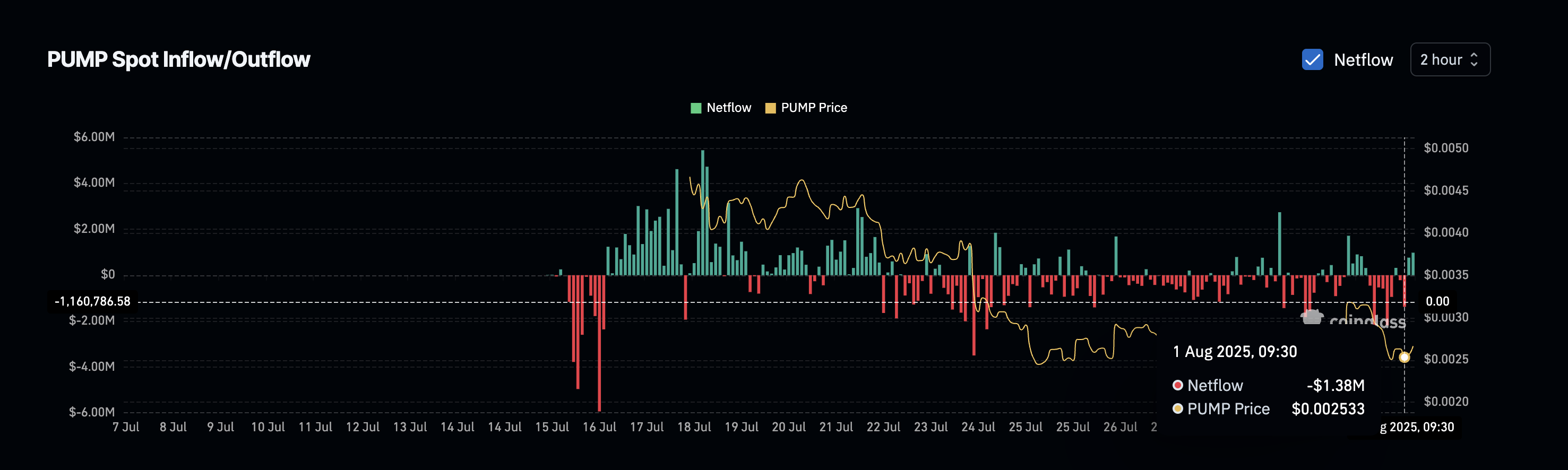 Coinglass деректері бөлшек трейдерлердің PUMP-ты биржаларға шығарып жатқанын көрсетеді, нетто ағындары бірнеше сағат ішінде 1,38 млн доллар шығыстан 1 млн долларға жуық оң көрсеткішке ауысты. Бұл жылдам өзгеріс кіші иелердің сату белсенділігінің артқанын көрсетіп, соңғы баға төмендеуін күшейтті.