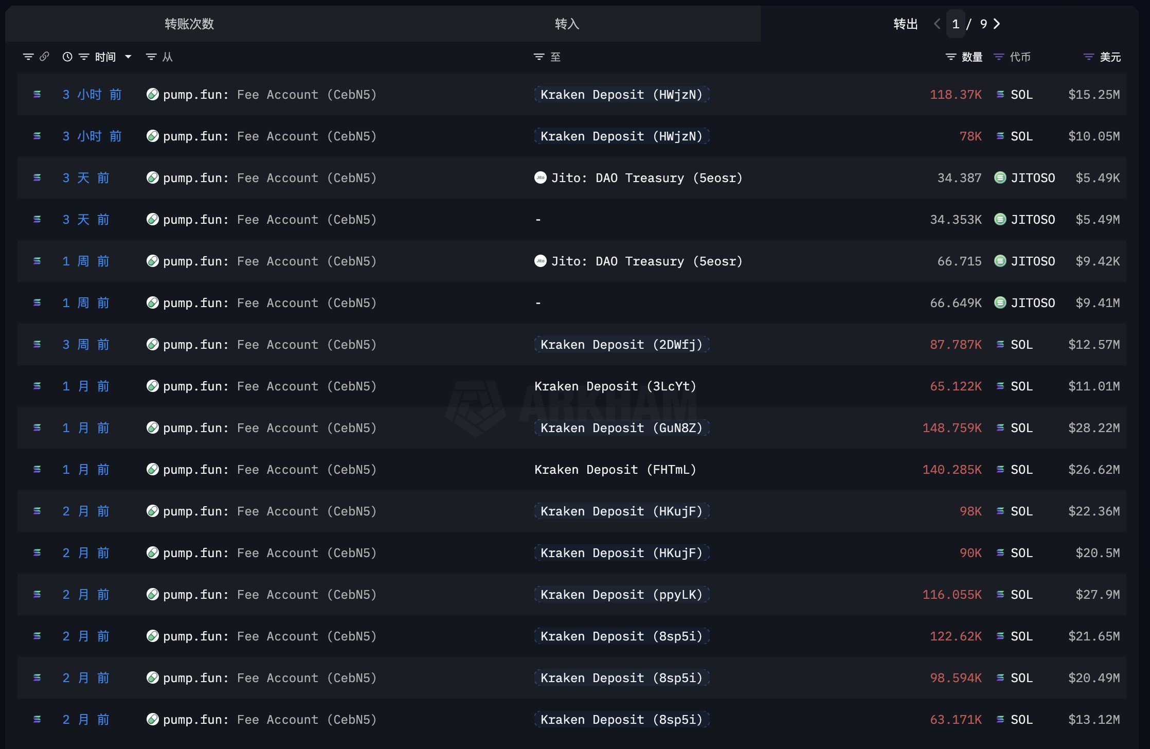 2025 жылдың қаңтар айында Lookonchain хабарлағандай, Pump.fun Kraken-ге 1,56 млн SOL аударған. 1-тоқсанда SOL бағасы 180–200 доллар аралығында болғандықтан, бұл сома 281 млн доллар мен 313 млн доллар аралығында бағаланды. Соңғы аударыммен бірге, биржаларға жіберілген SOL жалпы саны шамамен 1,76 млн SOL-ға жетіп, қазіргі бағамен шамамен 219 млн долларды құрайды.