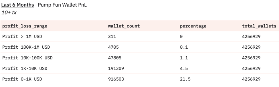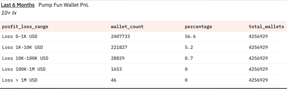 Атап айтқанда, соңғы алты айда 10-нан астам Pump.fun токендерін саудалаған 4,257 млн мекенжайлардың ішінде шамамен 2,4 млн мекенжай (56,6%) 0 доллар мен 1 000 доллар аралығында жиынтық шығынға ұшыраған.