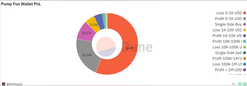 Pump.fun сауда деректерінің егжей-тегжейлі талдауы мемкоин маниясының артындағы қатал шындықты ашады. Dune Analytics-те жиналған деректерге сәйкес, Solana негізіндегі токен платформасымен айналысатын мекенжайлардың 60%-дан астамы айтарлықтай шығынға ұшыраған.