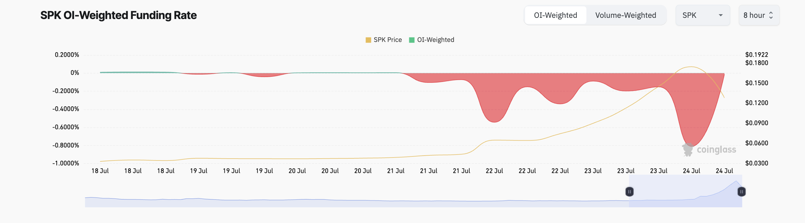 Сонымен қатар, SPK-ның фьючерстік нарықтағы көңіл-күйі барған сайын аюлы болып қалды. Бұл оның қаржыландыру мөлшерлемесімен көрінеді, ол 21 шілдеден бастап тек теріс мәндерді қайтарды.