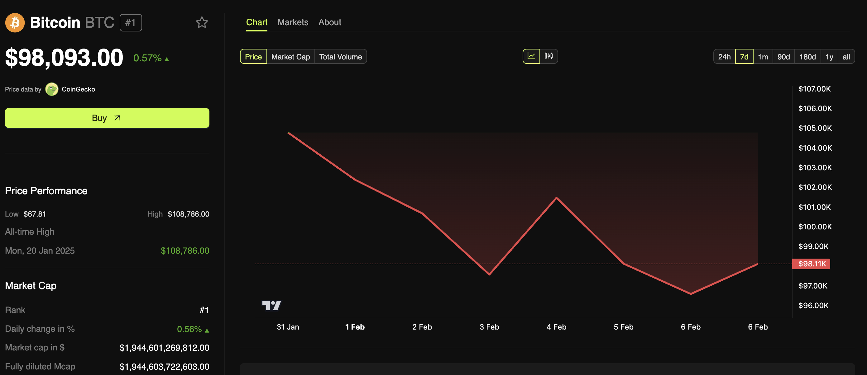 Содан бері Bitcoin айтарлықтай түзетулерді бастан кешіріп, алты таңбалы саннан төмен түсіп отырды. Жазу кезінде BTC 98 093 доллармен сатылды, бұл өткен күнмен салыстырғанда 0,57%-ға өсім болып табылады.