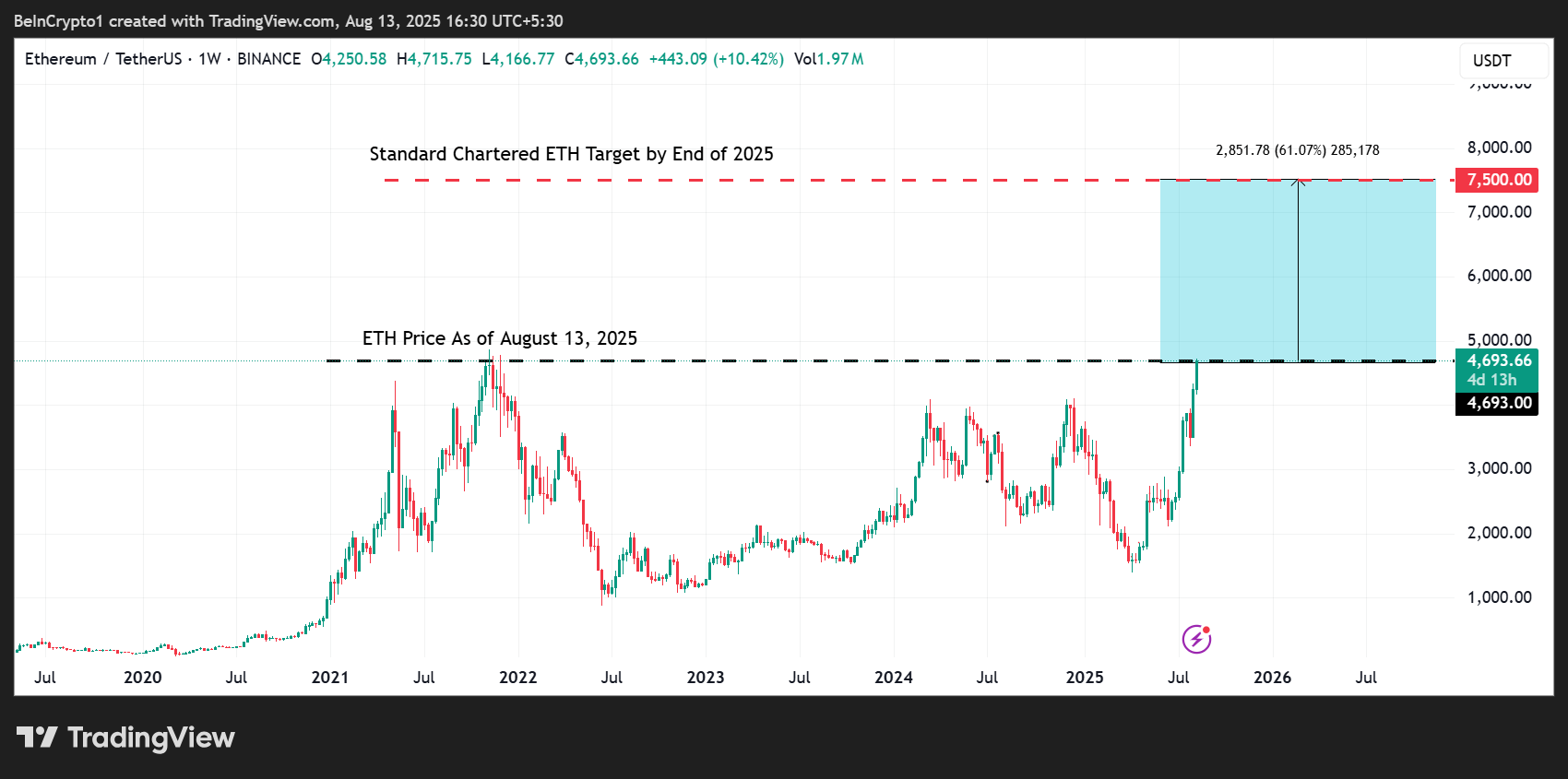 Бұл график Standard Chartered-тің бір ETH монетасына 7 500 доллар баға мақсаттарын жүзеге асыру үшін жылдың қалған бөлігінде Ethereum шамамен 60%-ға өсуі керек екенін көрсетеді.