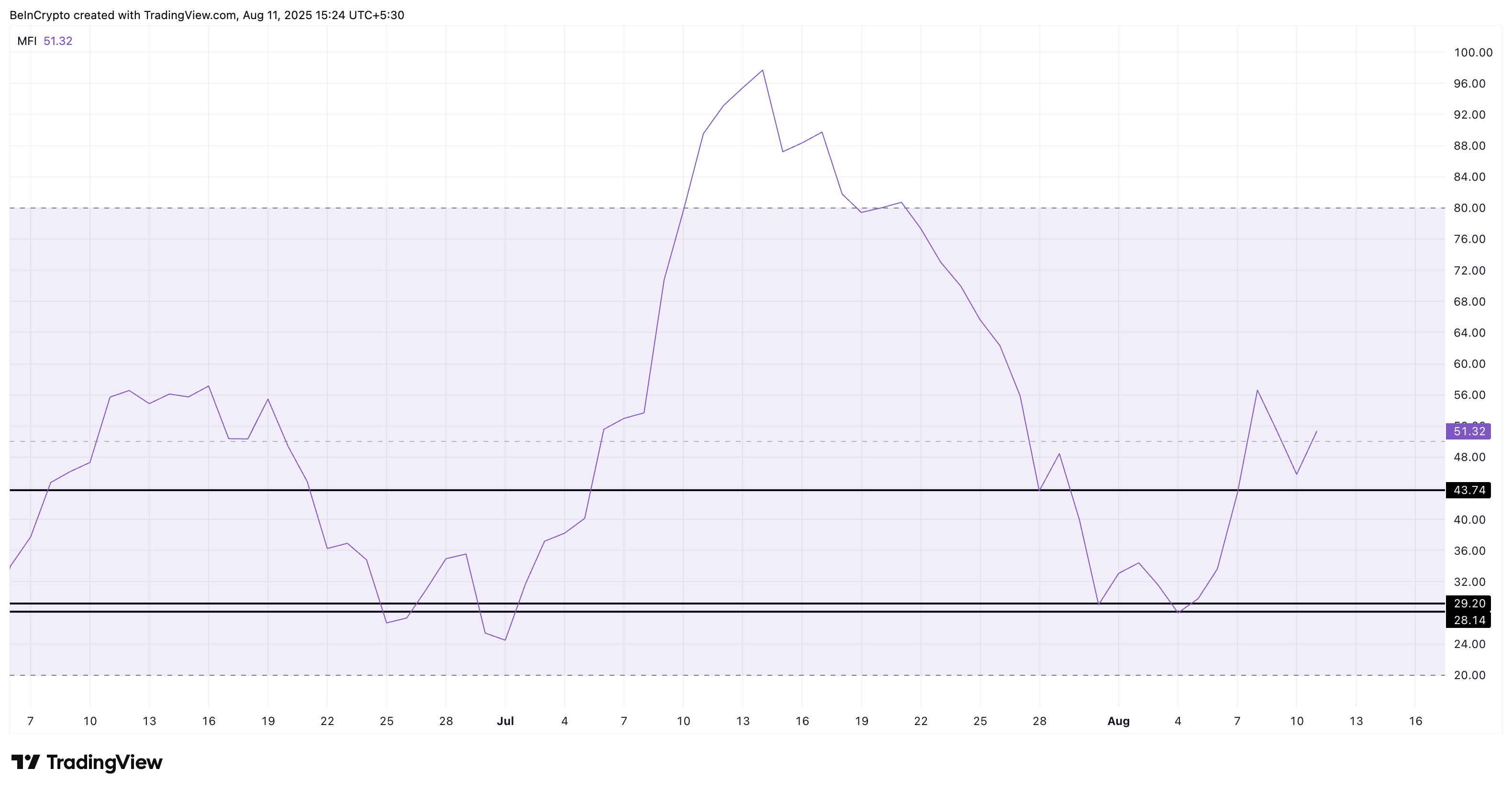 Бұл ауыр ұсыныс жағдайында сатып алу қысымы жоғалған жоқ. Күнделікті Ақша ағыны индексі (MFI), баға әрекетін көлеммен біріктіріп, нақты капитал ағындарын қадағалайды, 50-ден жоғары 51,32 деңгейінде тұр және шілде айындағы 29-ға жақын төменгі деңгейлерді қайта сынаудан аулақ болғаннан кейін жақында жоғары қарай бұрылды.