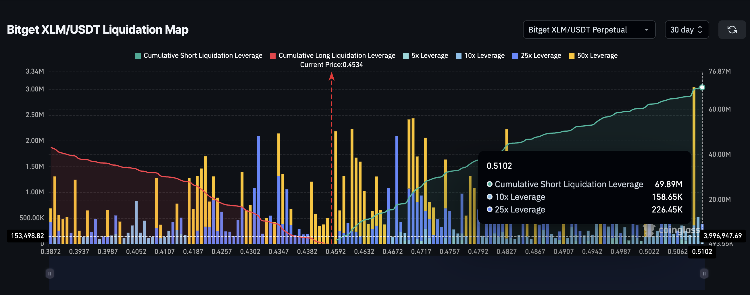 Егер баға 0,47 долларға жетсе, қысқалардың ликвидациясы XLM бағаларын жоғарырақ итермелей алады, бұл каскадты раллиге ұқсас болады.