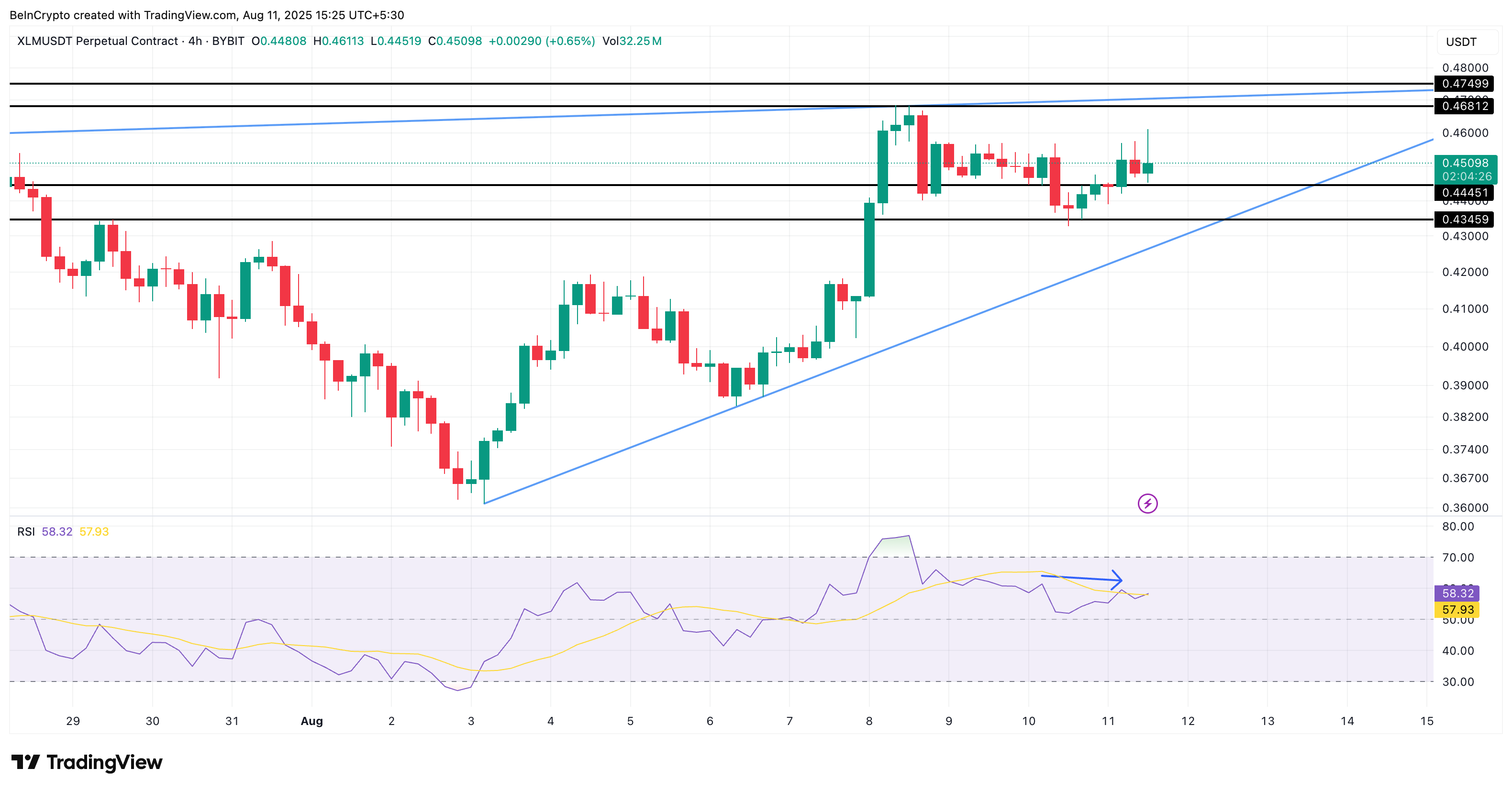 Бұл сатып алушы мен сатушы арасындағы тығырықтың жақын арада бұзылатынын көру үшін 4 сағаттық графикке жүгінеміз. Мұнда XLM бағасы көтерілу үшбұрышында тұр; бұқалық жалғастырушы құрылым, негізгі қолдау 0,44 долларда және қарсылық деңгейлері 0,46 және 0,47 долларда.