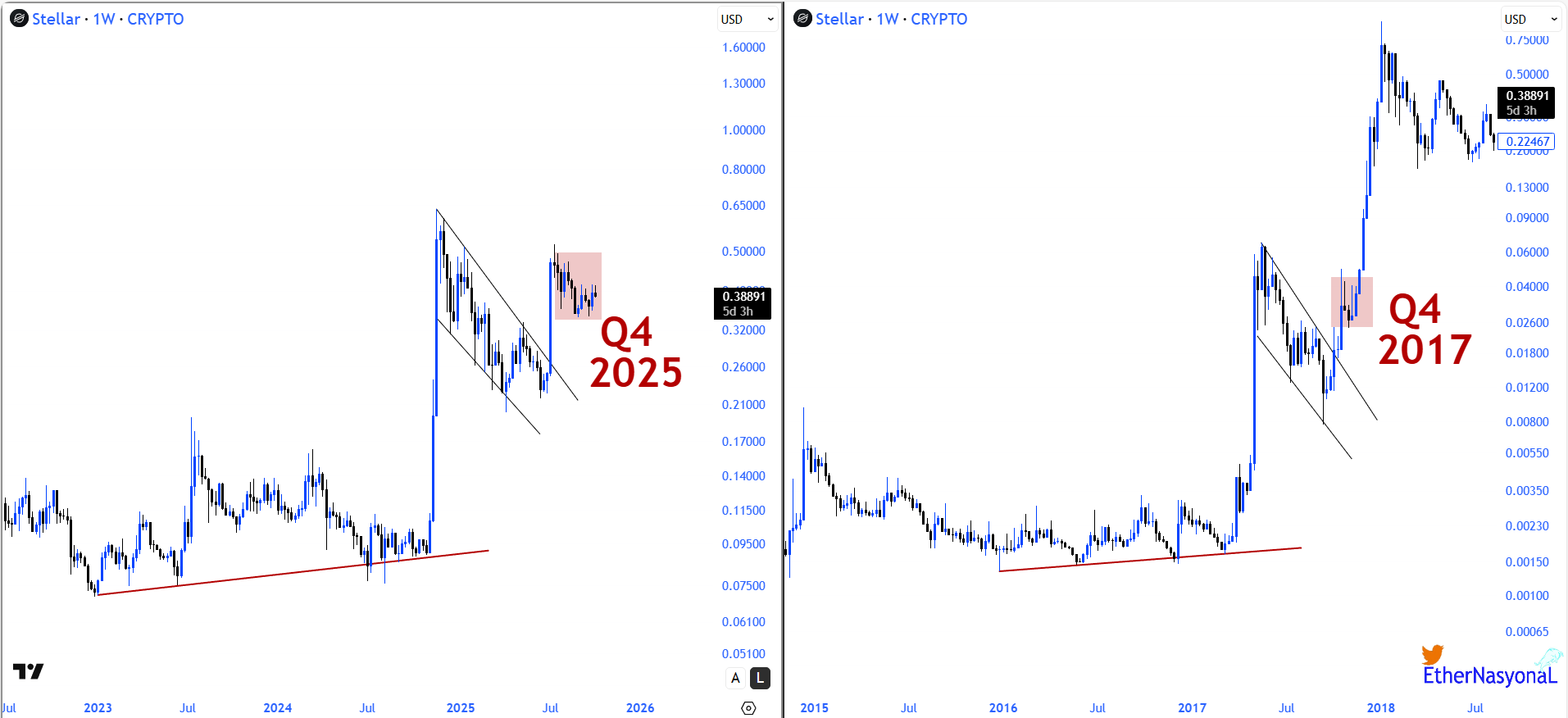 «XLM-нің апталық графигіндегі 2017 және 2025 құрылымдары таңқаларлықтай ұқсас. Екеуі де ұзақ уақыт бойы төмендейтін сынадан кейінгі бұзылуды көрсетеді. 2017 жылғы бұзылу агрессивті раллиге әкелді. 2025 жылғы орнатылым сол техникалық негізде қалыптасып жатқан сияқты», – деп сарапшы айтты.