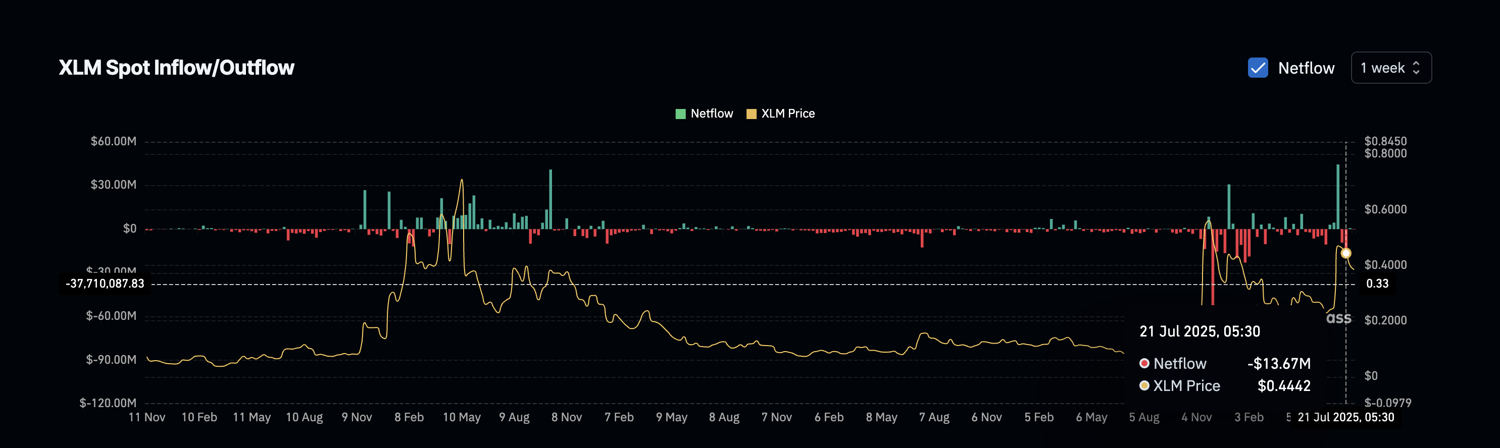 Ұзақ/қысқа шоттар арақатынасында да өзгеріс айқын көрінеді. Coinglass мәліметтері бойынша, трейдерлердің 60,67%-ы қазіргі уақытта XLM бойынша қысқа позицияларды ұстап отыр, бұл көпшіліктің Stellar (XLM) бағасының одан әрі төмендеуін күтетініне белгі. Қатты қысқа нарық кейде қысқа сығуға әкелуі мүмкін болса да, бұл жағдайда ол Stellar бағасының теріс әрекеті мен тренд индикаторларымен сәйкес келеді.