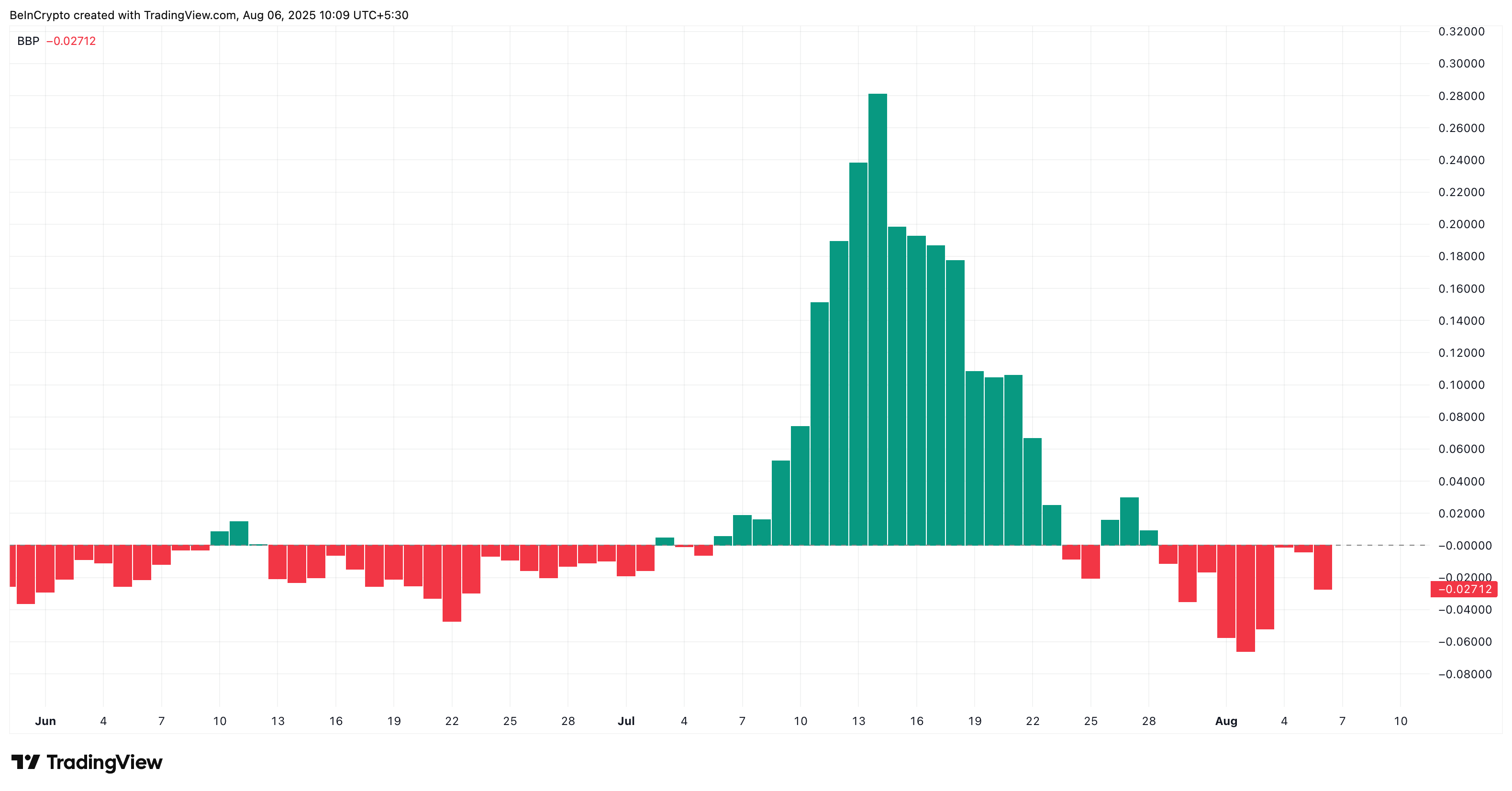 BBP соңғы баға қозғалыстарында сатып алушылардың (бұқалар) және сатушылардың (аюлар) күшін өлшейді. Ол теріс болғанда, аюлардың бақылауда екенін көрсетеді.