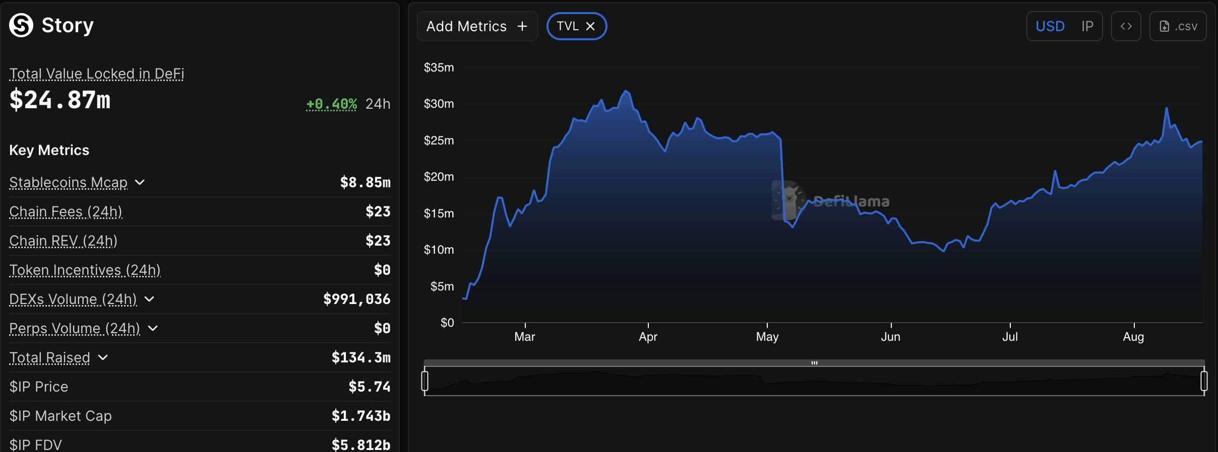 Алайда, Story Protocol қазіргі уақытта шамамен 25 млн доллар ғана Жалпы құлыпталған құнға (TVL) ие. Оның күнделікті төлем табысы небәрі 17 доллар шамасында, бұл басқа блокчейндермен салыстырғанда қарапайым көрсеткіш.