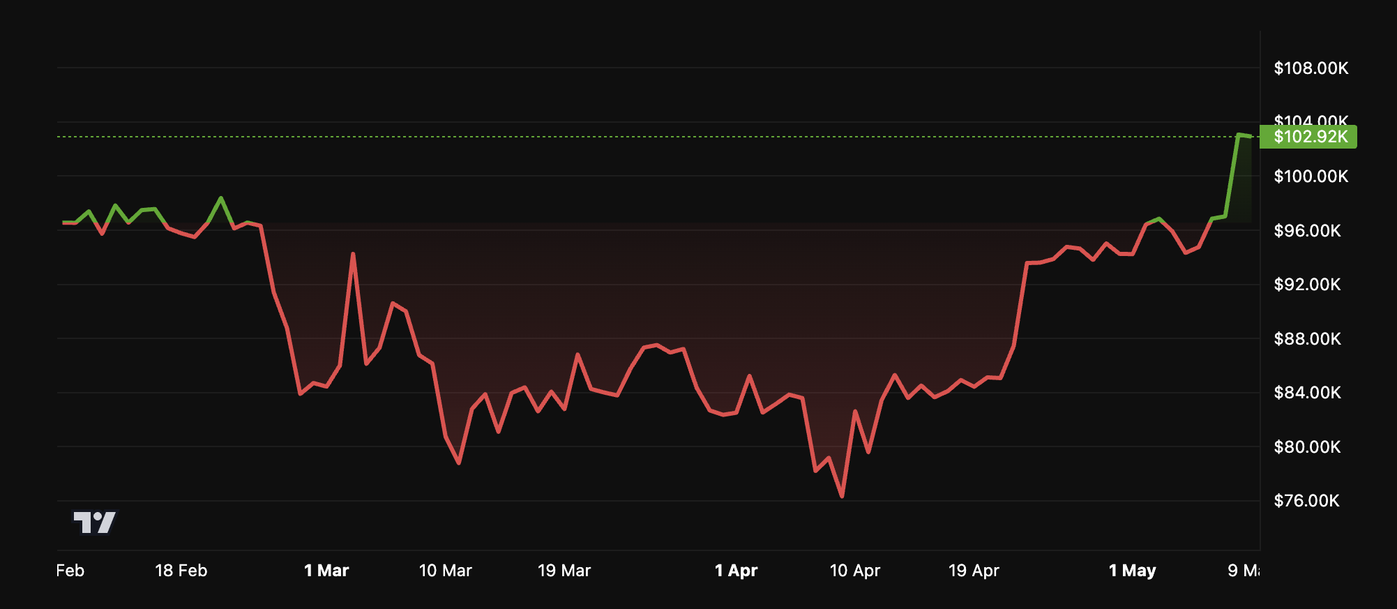 Бұл шыңға ол биткоин 7 сәуірде бірнеше айлық ең төменгі деңгейге 74 393-ке құлдырағаннан кейін бір ай өткен соң, 100 000 доллар шегінен асқан кезде жетіп отыр.