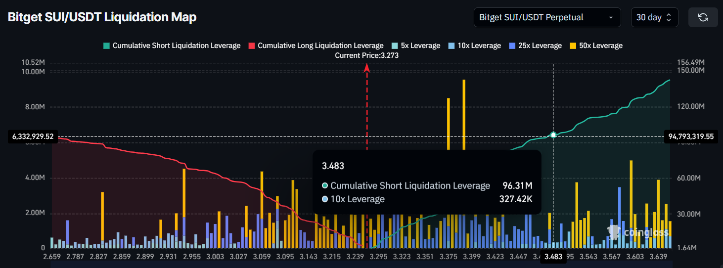 Өтімділік деректеріне сәйкес, SUI бағасы 3,48 долларға жетсе, 96 млн доллар көлемінде өтімділіктерге тап болуы ықтимал. Бұл негізінен бағаның төмендеуіне бағытталған қысқа трейдерлерге әсер етеді.