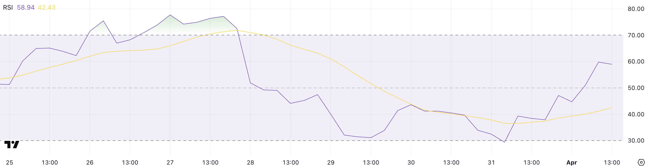 SUI-дің Салыстырмалы күш индексі (RSI) 58,94-ке дейін күрт көтерілді, бұл бір күн бұрынғы 29,38-ден жоғары, қысқа мерзімді көңіл-күйдің күшті өзгерісін көрсетеді.