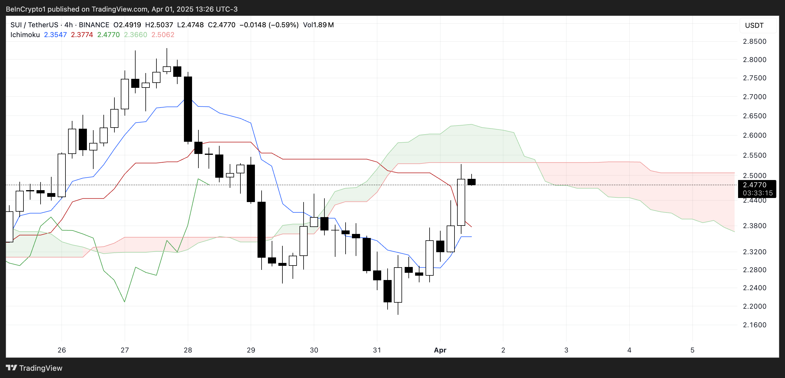 SUI блокчейнінің Ишимоку бұлты графигі ықтимал серпіліс әрекетін көрсетеді, себебі баға жоғары көтеріліп, қазір Кумо (бұлт) шетінде тұр.