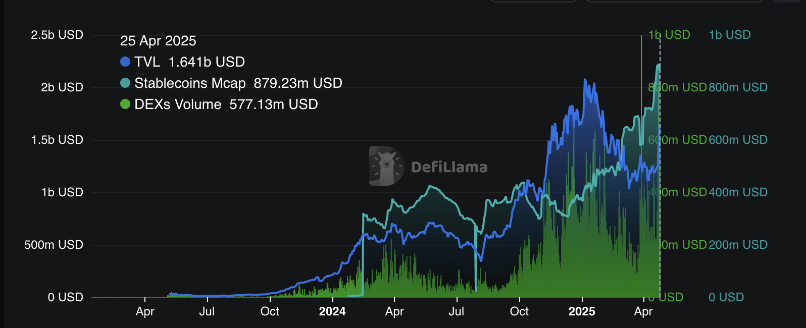 24 сағаттық сауда көлемі орталықтандырылмаған биржаларда (DEXs) да айтарлықтай өсіп, 577 млн долларға жетті, бұл өткен аптадан 167%-ға артық. Сонымен қатар, Sui желісіндегі стейблкоиндер соңғы екі айда 482 млн доллардан 879 млн долларға дейін тез өсті, бұл 82%-ға өсуін білдіреді.