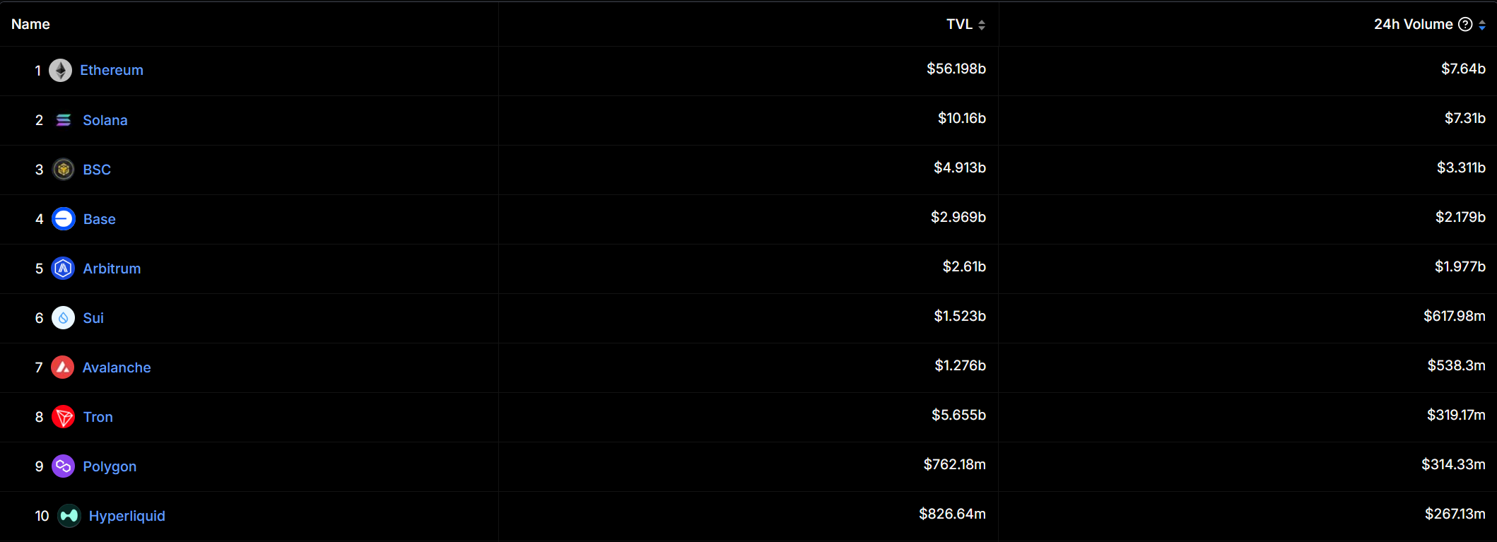 SUI блокчейні күнделікті көлемі соңғы 24 сағат ішінде 615 млн долларды құрады, бұл оны көлем бойынша алтыншы ірі блокчейн етеді. Бұл оны Avalanche, Hyperliquid, Polygon және Tron сияқты жақсы танымал желілерден алда қояды, бұл күшті нарықтық белсенділікті көрсетеді.
