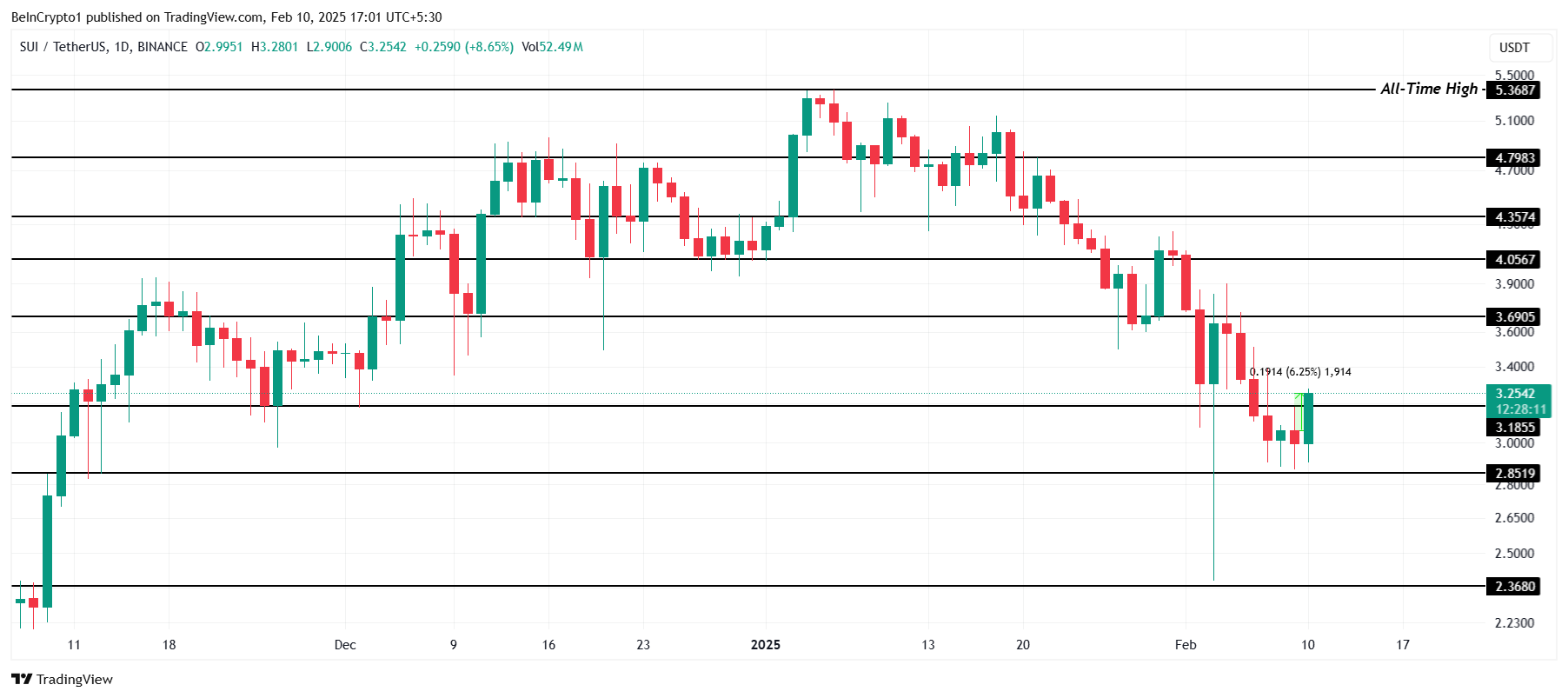 SUI бағасы соңғы 24 сағат ішінде 6% өсті, қазіргі уақытта 3,25 доллар деңгейінде саудалануда. Нарықтағы кең ауқымды аю жағдайларына қарамастан, альткоин 3,00 доллардан жоғары деңгейін сақтап қалды. Бұл тұрақтылық 2,85 доллар дағдарыстық қолдау деңгейінен төмен түсуге жол бермей, қалпына келу үмітін сақтап тұр.