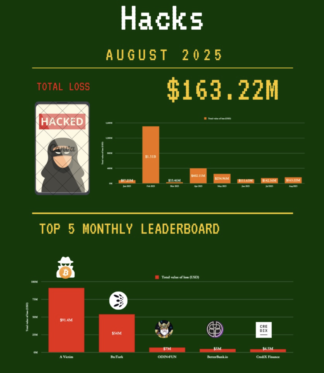 2025 жылдың тамыз айындағы хакерлік шабуылдар блокчейн қауіпсіздігіндегі маңызды оқиғалар айын көрсетті. 16 ірі крипто шабуыл жалпы 163 млн доллар шығынға әкеліп, шілде айындағы 142 млн доллардан 15%-ға өсті.