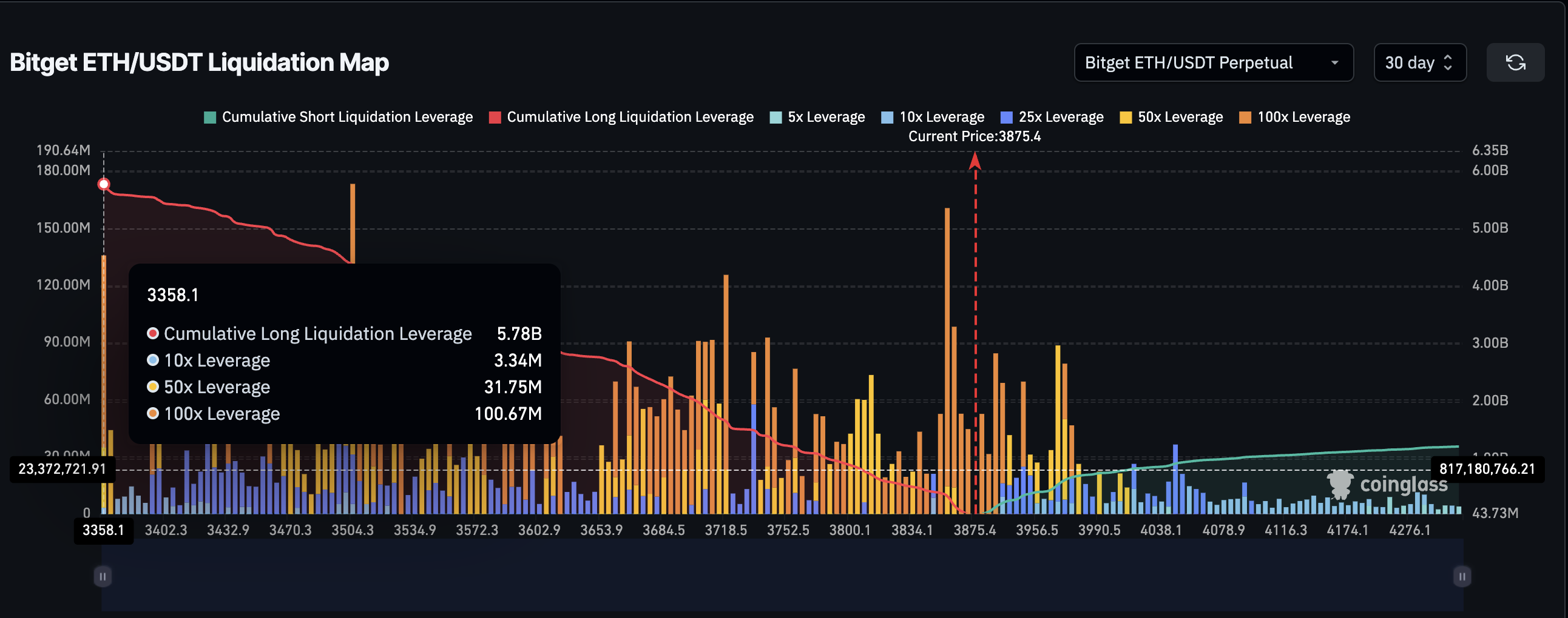 Соңғы Bitget ETH/USDT ликвидация картасына сәйкес, 3 358 және 3 875 доллар арасында 5,78 млрд доллардан астам жиынтық ұзақ левередж жиналған. ETH саудасы осы аймақтың жоғарғы шегінде жүріп жатқандықтан, ол қауіпті аймаққа жақын тұр.