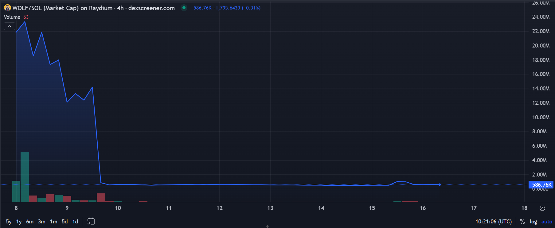 Алайда, басқа Дэвиске қатысты монеталар сияқты, бұл өсу ұзаққа созылмады, себебі WOLF-тың құны сарапшылар раг пул схемасы деп күдіктенгендей құлдырады. Блокчейн деректері токеннің 82%-ын аздаған әмияндар тобы иеленгенін көрсетті, бұл ішкі бақылауды білдіреді.
