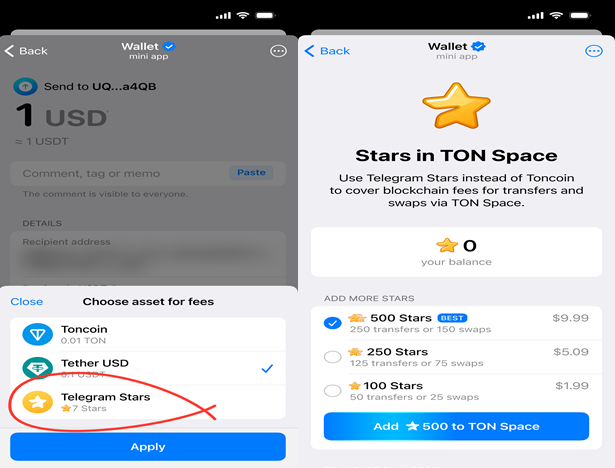 «Сіз жұлдыздарды токендерді жіберу немесе айырбастау үшін блокчейн төлемдерін төлеу үшін пайдалана аласыз. Шығару және айырбастау беттерінде сізде блокчейн төлемін жұлдыздармен төлеу мүмкіндігі бар. Егер сіздің TON Space балансында жеткілікті жұлдыздар болмаса, сіз оларды өзіңіздің кастодиалды емес әмияныңыздан сатып ала аласыз», – деп жаңа мүмкіндіктердің сипаттамасы оқылады.