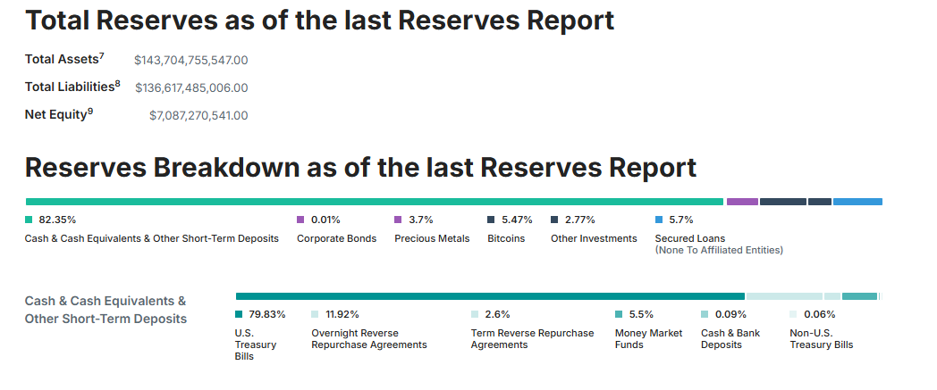 Tether өзінің резервтерін ашуға тырысқанымен, олардың 82,35%-ы қолма-қол ақша, қолма-қол ақша баламалары және басқа қысқа мерзімді депозиттерден тұрады. Олардың шамамен 80%-ы АҚШ қазынашылық вексельдерінде.