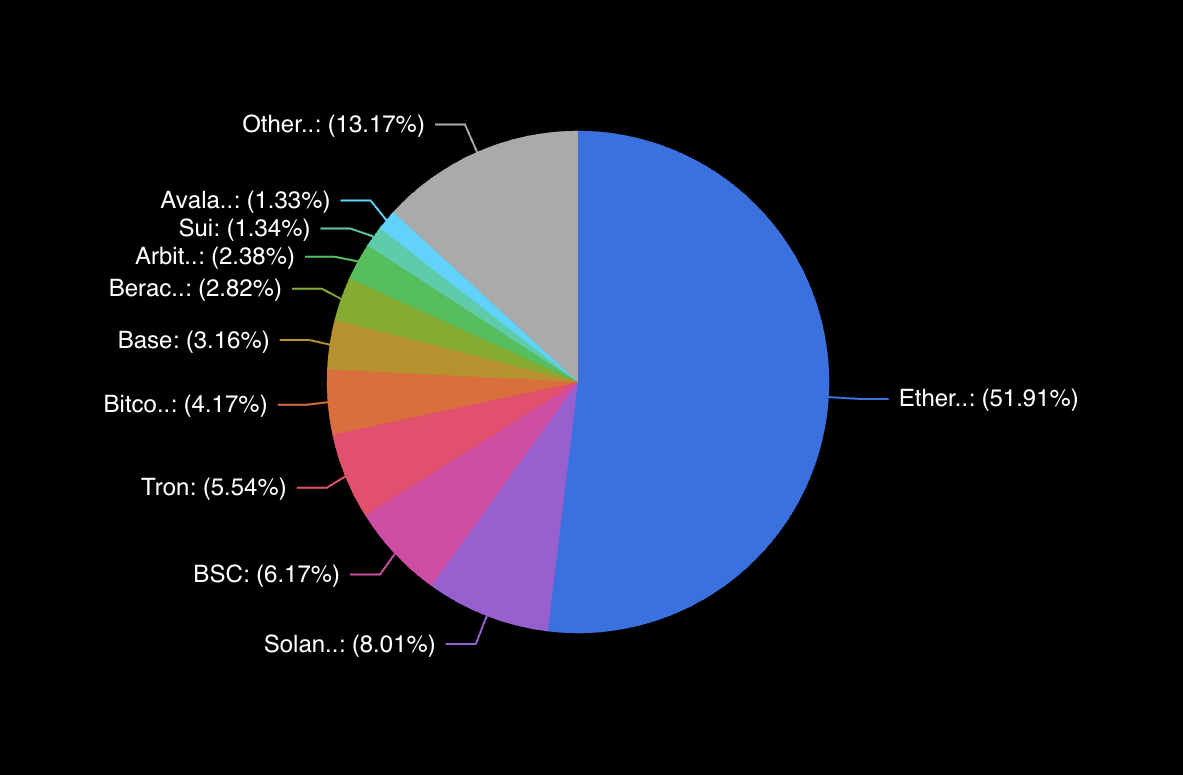 DefiLlama деректеріне сәйкес, 2025 жылдың сәуірінде Ethereum (ETH) барлық тізбектер арасында TVL бойынша ең жоғары орында тұр, нарықтың жартысынан астамын басқарады. Сонымен қатар, Polygon (POL) TVL-і 760,9 млн доллар болып, 13-ші ең үлкен тізбек болып табылады.