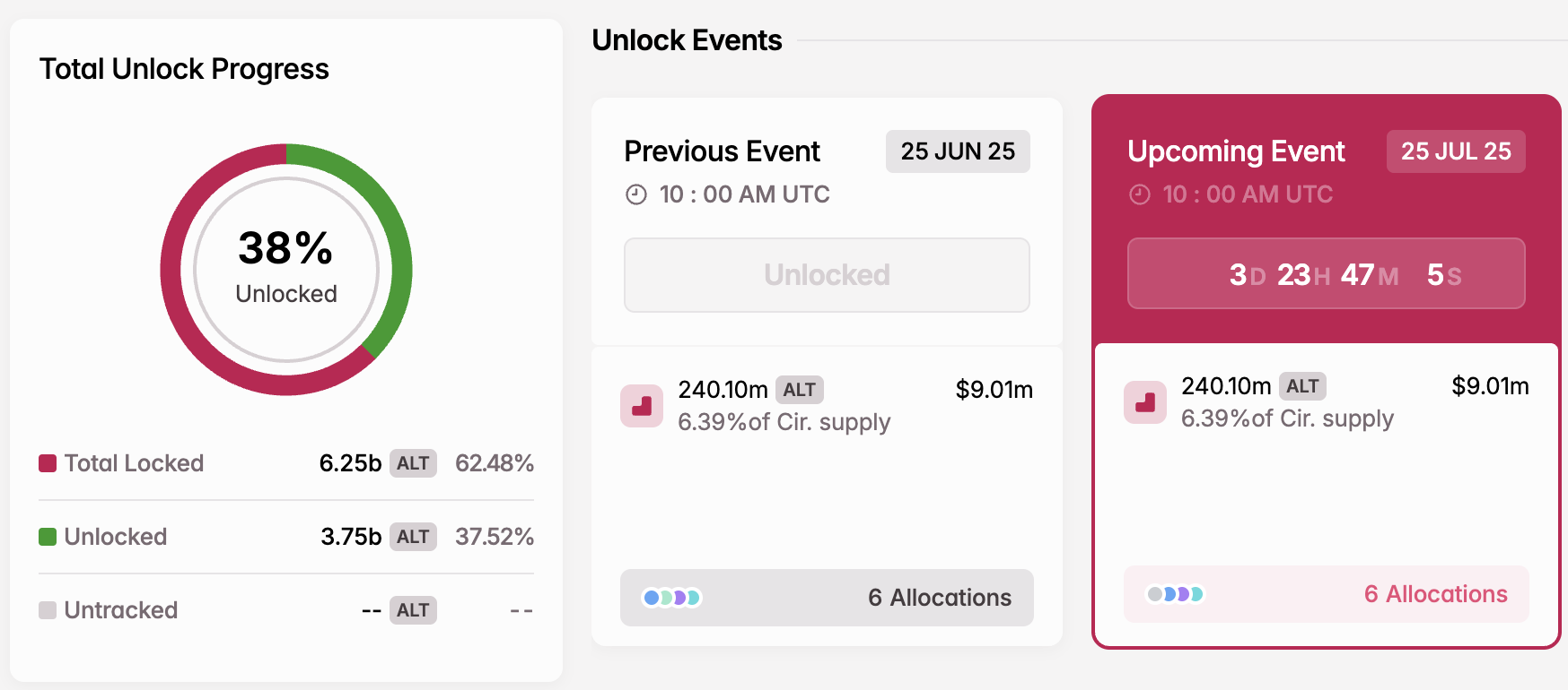 Желі 240,10 млн ALT токендерін ашады, олардың құны 9,01 млн доллар. Бұл ашылу айналымдағы ұсыныстың 6,39%-ын құрайды.