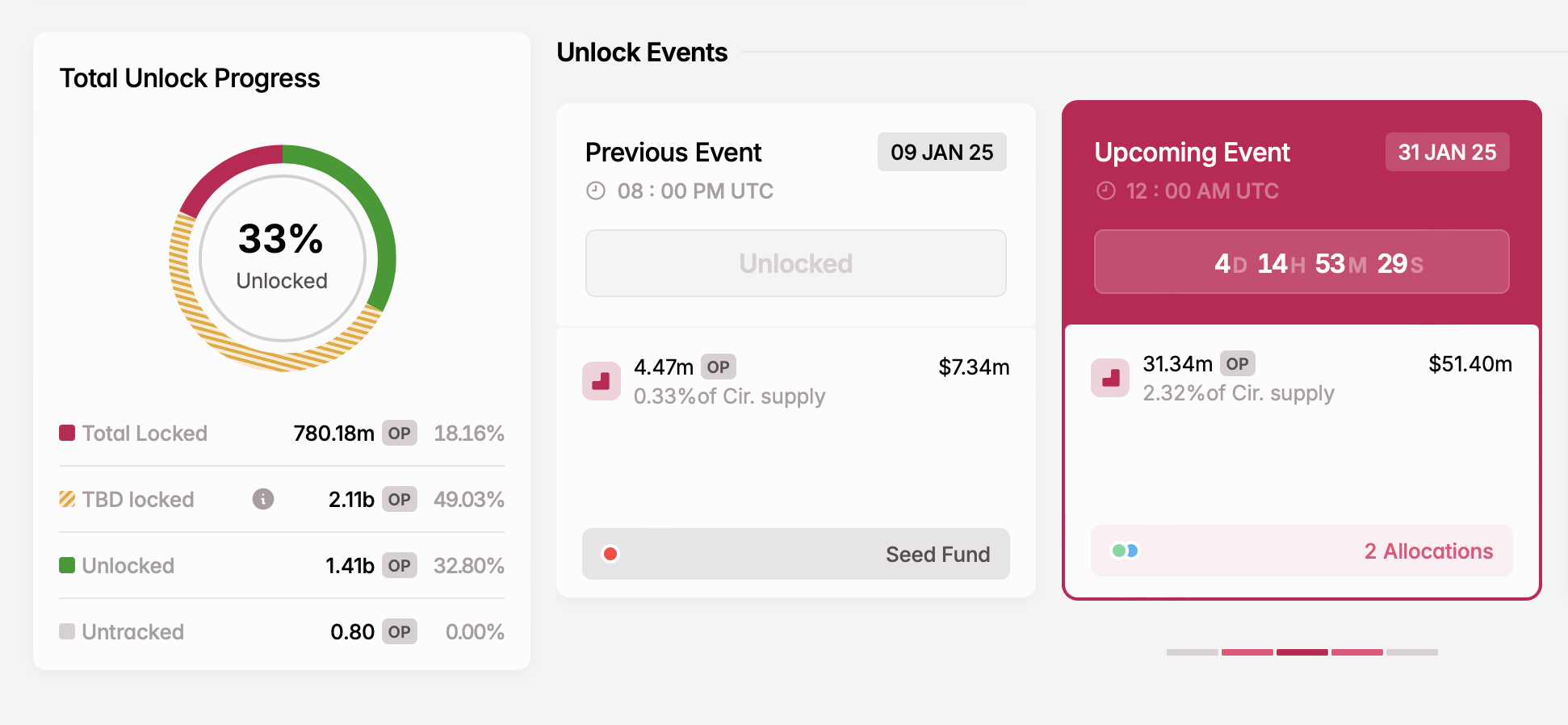 Қаңтар 31 күні Optimism 31,34 млн OP токендерін ашады. Tokenomist (бұрынғы TokenUnlocks) мәліметі бойынша, бұл токендер негізгі қатысушылар мен инвесторларға таратылады.