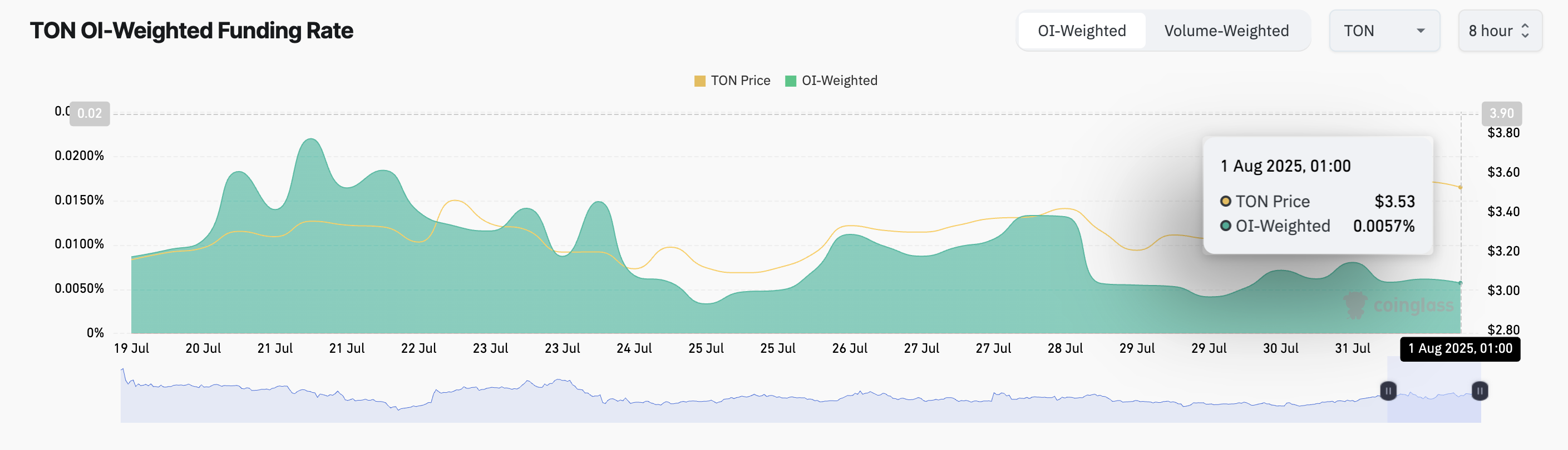 Сонымен қатар, TON-ның қаржыландыру мөлшерлемесі соңғы күндегі кеңірек нарықтың көрсеткіштеріне қарамастан оң болып қалды. Бұл жазу кезінде, ол 0,0057%-ды құрайды, бұл фьючерстер нарығы қатысушылары арасында ұзақ позицияларға деген артықшылықты көрсетеді.