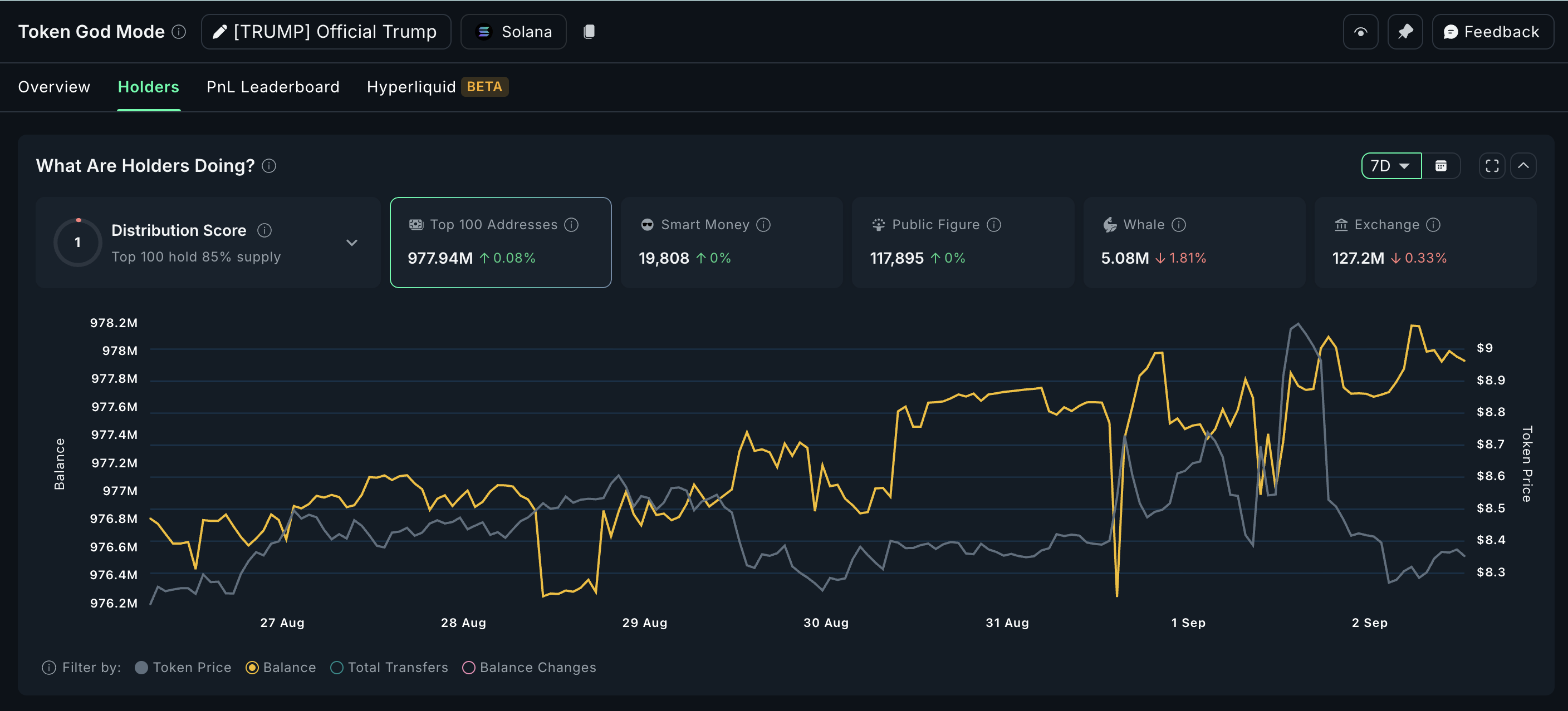 TRUMP әлсіздігіне қарамастан, өткен аптадағы он-чейн жинақтау таза оң болды. Алғашқы 100 мекенжай шамамен 0,78 млн токен қосты, бұл ағымдағы бағамен шамамен 6,47 млн долларға тең.