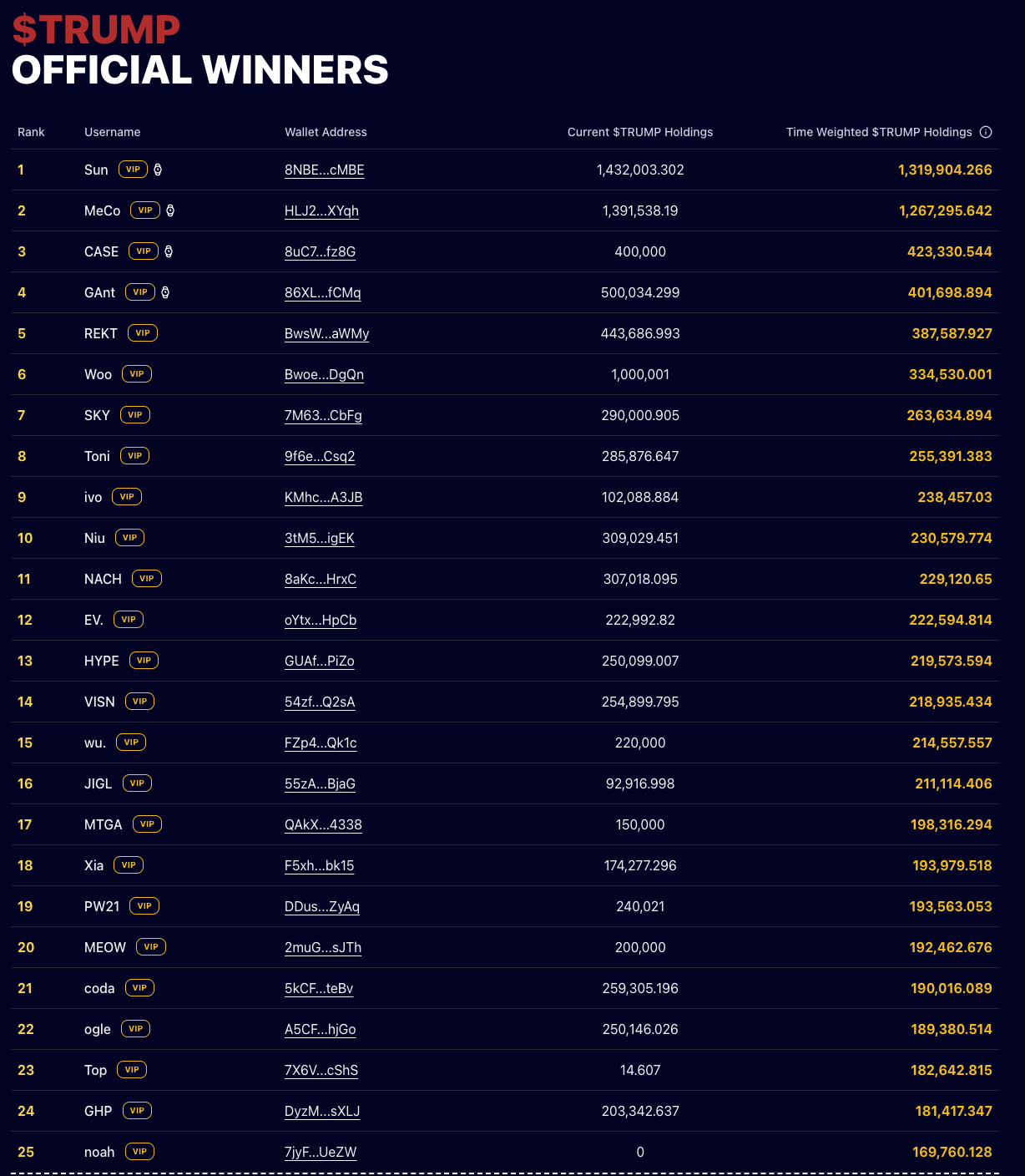 TRON негізін қалаушы Джастин Сан TRUMP токендеріне шамамен 16 млн доллар құйып, көшбасшылар тақтасында бірінші орынды иеленді, оның жалпы иелігі 1 430 000-нан асты. Сан өзінің қатысуын X жазбасында растап, кешкі ас әртүрлі көшбасшылармен байланыс орнатуға маңызды мүмкіндік беретінін қосты.