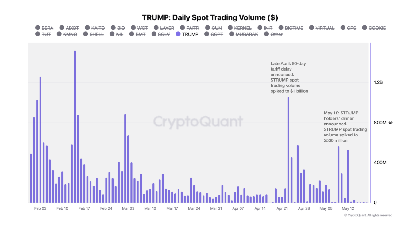 «Мысалы, 12 мамырда жеңімпаздар жарияланған кезде токеннің сауда көлемі 530 млн долларға дейін өсті. Бұған дейін, сәуір айының соңында Трамптың тарифтерді тоқтату туралы хабарландыруы сауда көлемін 1 млрд долларға дейін жеткізді. Сол сияқты, TRUMP бағасы осы кезеңде 7,5 доллардан 12,7 долларға дейін қалпына келді», – деді CryptoQuant зерттеу бөлімінің басшысы Хулио Морено BeInCrypto-ға.