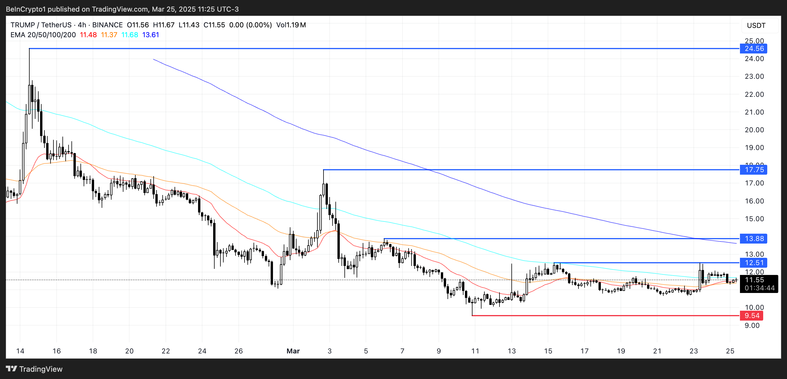 2 сәуірдегі Бостандық күніне қатысты күтуге қарамастан, TRUMP мемкоині 12 доллар шамасында немесе одан төмен күресуді жалғастыруда.