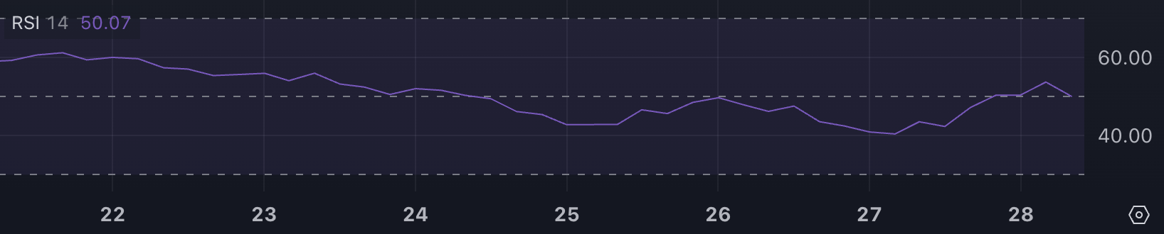 RSI – баға өзгерістерінің жылдамдығы мен ауқымын өлшеу үшін қолданылатын импульс индикаторы. Ол 0-ден 100-ге дейінгі аралықта болады, 30-дан төмен мәндер артық сатылған жағдайларды көрсетеді. 70-тен жоғары мәндер артық сатып алынған жағдайларды білдіреді, ал 50 шамасындағы мәндер бейтарап импульсті көрсетеді.