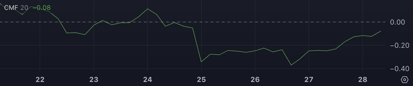 TRUMP Chaikin Money Flow (CMF) -0,08-ге дейін жақсарды, екі күн бұрын -0,37 болған. Бұл жоғары қозғалыс сату қысымының азайғанын және капитал ағындарының артып келе жатқанын көрсетеді, дегенмен жалпы ағындар әлі де ағындардан сәл асып түседі.