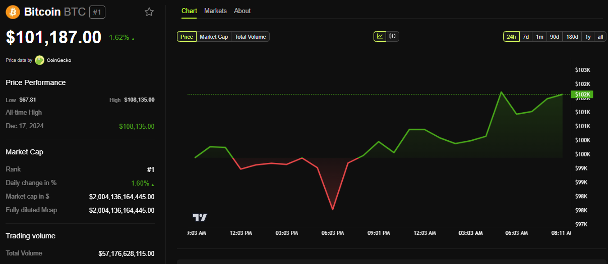 BeInCrypto деректері бойынша, жазу кезінде Bitcoin 101 187 доллар бағасымен саудаланып жатыр. Бұл жұма сессиясы ашылғаннан бері шамамен 2% өсуін білдіреді.