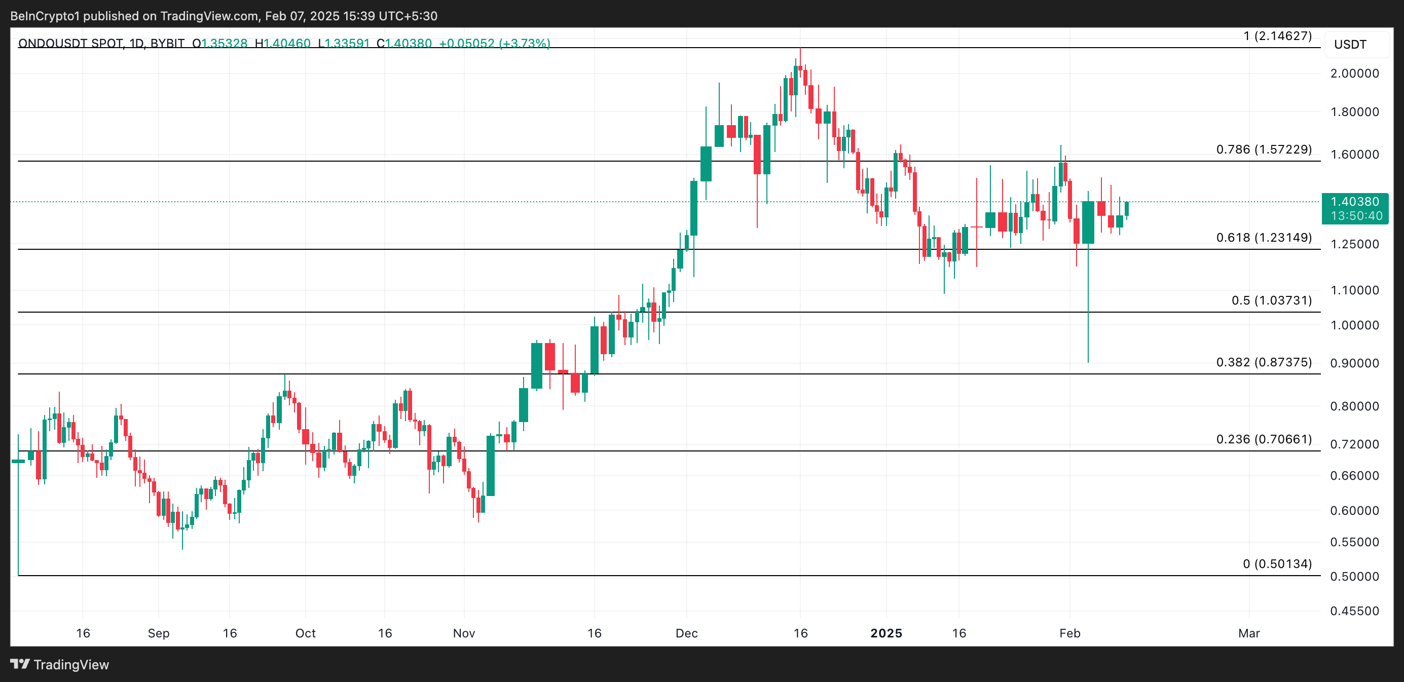 Алайда, осы дамуларға қарамастан, ONDO-ның өнімділігі әлсіз болып қалды. Соңғы 24 сағат ішінде ол өзінің құнының 0,1%-ын жоғалтты. Баспасөз уақытында альткоин 1,40 доллар бағасымен саудалануда.