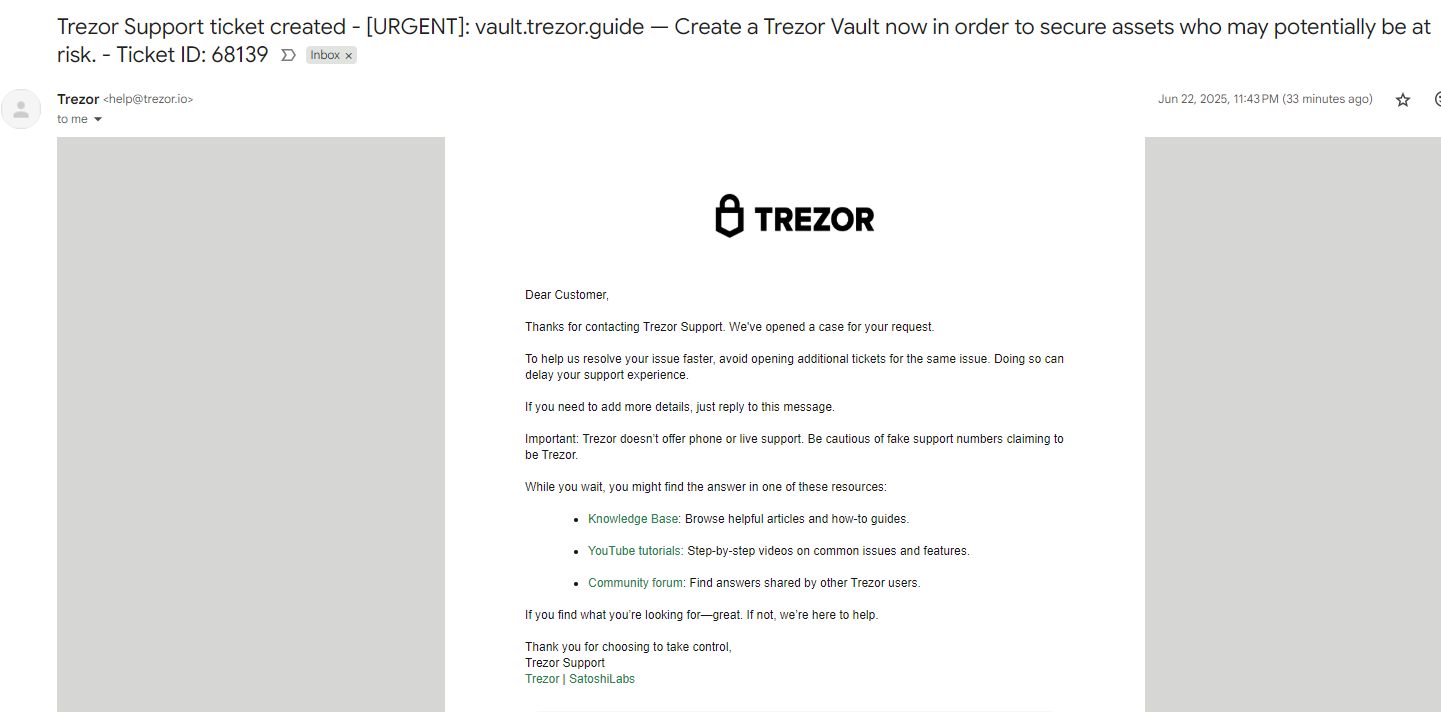 Бүгін таңертең Trezor өз клиенттерін қолдау хаттары түрінде келетін ықтимал фишингтік алаяқтық туралы ескертті:
