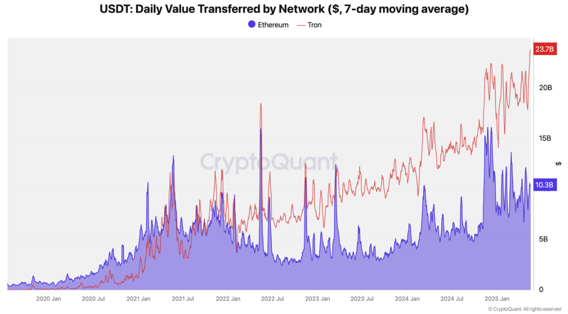 Tron-дағы күнделікті USDT аударым көлемі рекордтық 23,7 млрд долларға жетті. Бұл Ethereum-ның орташа 10,5 млрд долларынан көп, 2024 жылдың соңындағы шыңынан 37%-ға төмендеді.