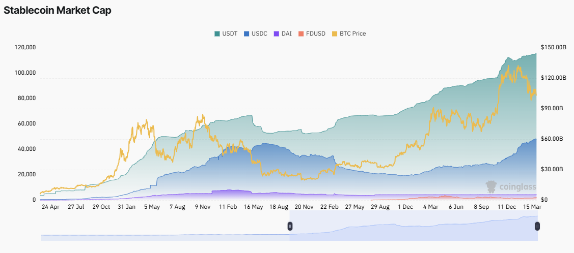 Бұл жазу кезінде стейблкоин нарығының капитализациясы 230 млрд доллардан асты. Tether-дің USDT 61%-ды құрайды, ал Circle-дің USDC 25%-ды ұстайды.