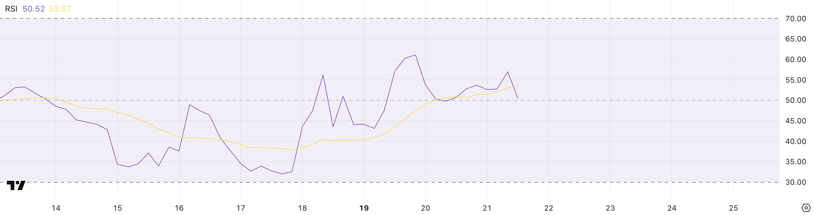 Салыстырмалы күш индексі (RSI), соңғы баға өзгерістерінің жылдамдығы мен ауқымын өлшейтін, қазіргі уақытта 50,52 деңгейінде тұр.