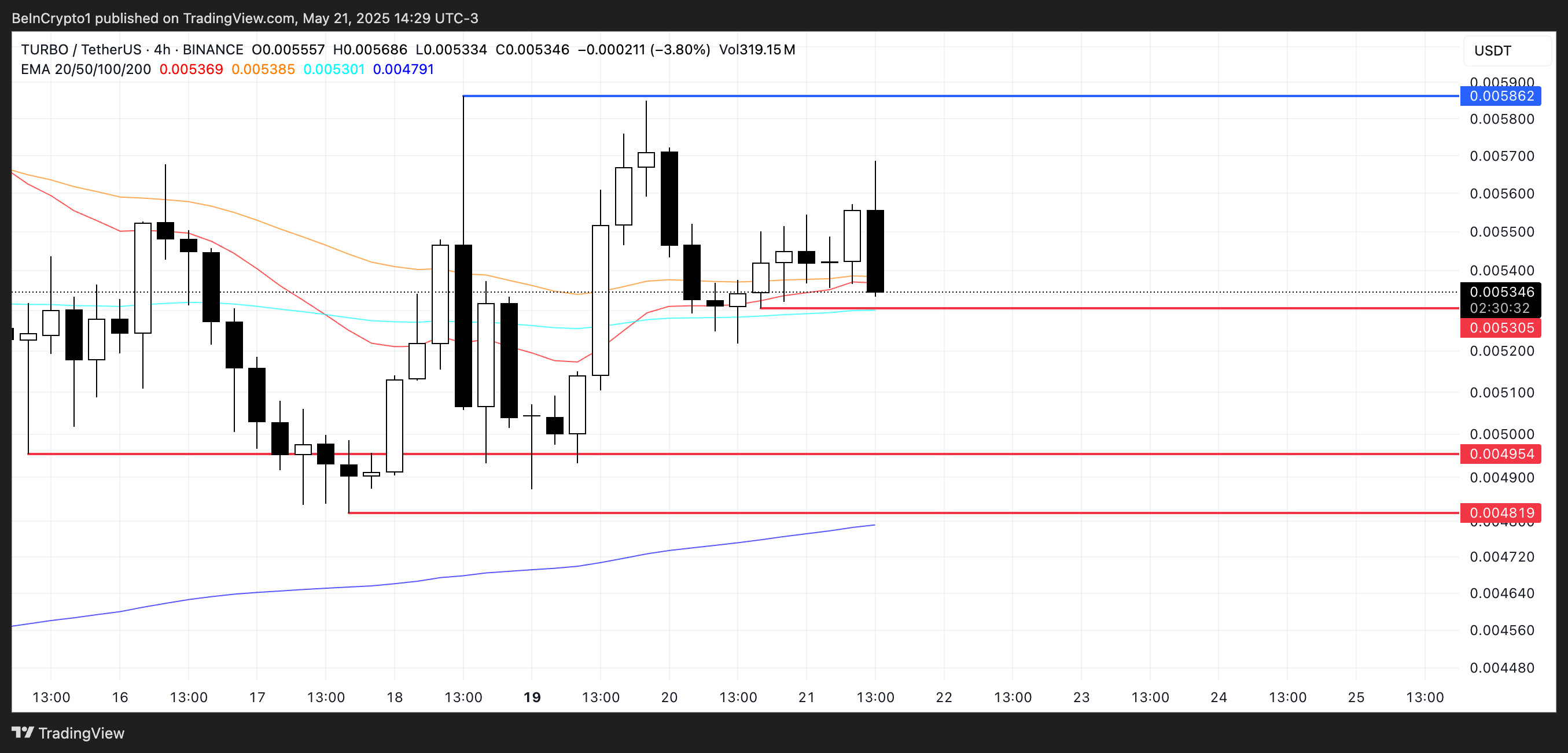 Бұл баға аймағы маңызды—егер қолдау сәтсіздікке ұшыраса, TURBO 0,0049 долларға және мүмкін 0,00481 долларға дейін төмендеуі мүмкін, егер аю қысымы күшейсе.