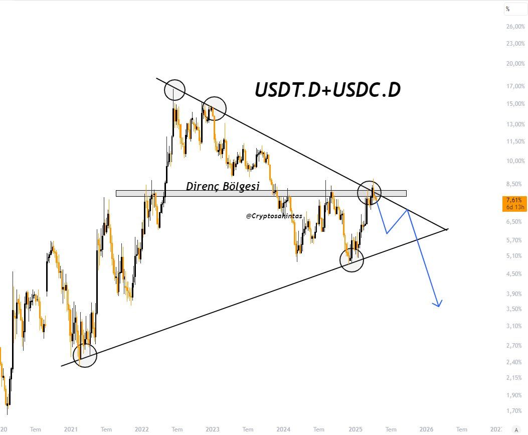 Инвестор Cryptosahintas осы айда біріктірілген USDT.D + USDC.D индексі 8% дағдарыстық қарсылық деңгейіне жеткенін ашты. Бұл альткоиндар үшін бұқа белгісі. Стейблкоин үстемдігі қарсылыққа жауап бергенде, бұл капиталдың альткоиндарға ағып кетуге дайындалып жатқанын жиі білдіреді, бұл күшті баға көтерілуін тудыруы мүмкін.