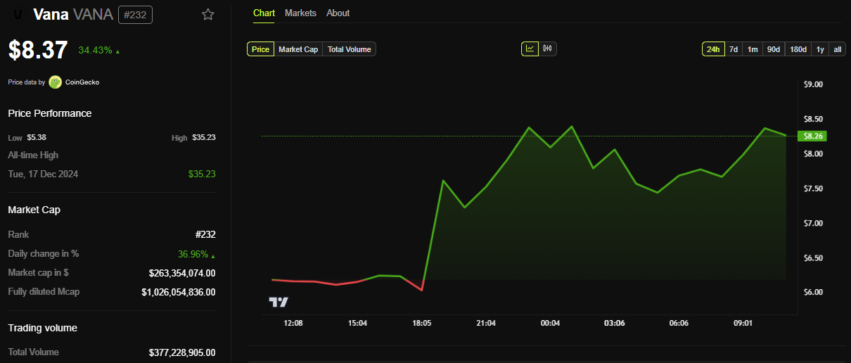 BeInCrypto деректеріне сәйкес, VANA токені осы жазба кезінде шамамен 35%-ға өсіп, 8,37 доллар болды.