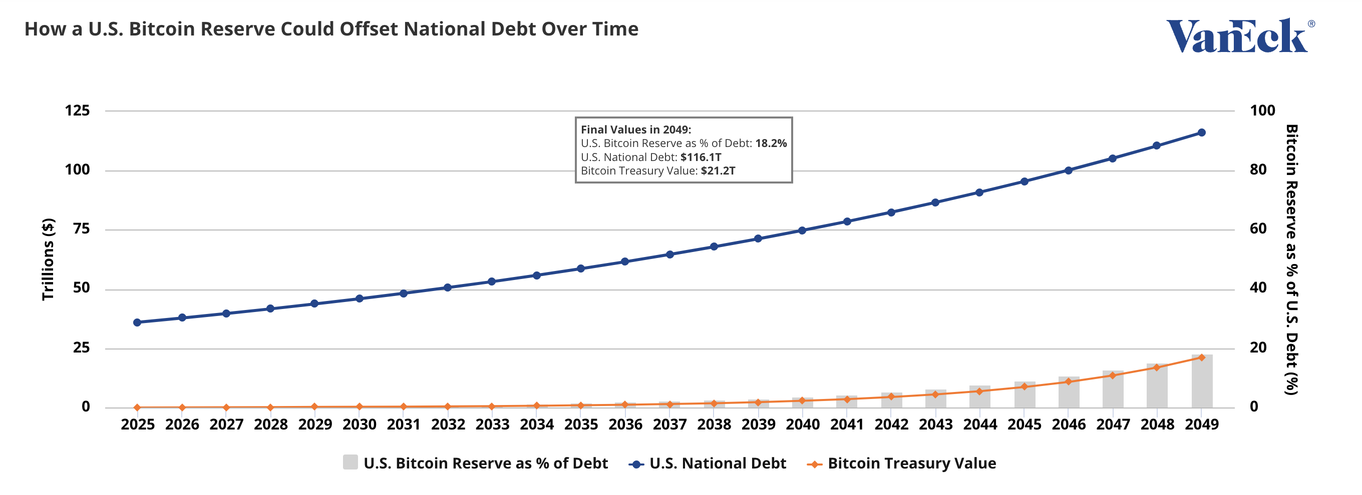 Талдау АҚШ қарызы мен биткоиннің болашақ өсу қарқынына қатысты болжамдарға негізделген. VanEck ұлттық қарыздың жылдық өсу қарқынын 5% деп болжады. Бұл 2025 жылы 36 трлн доллардан 2049 жылға қарай шамамен 116 трлн долларға дейін өсуін көрсетеді.
