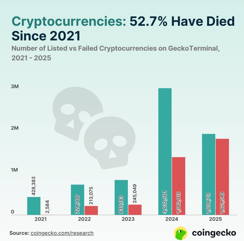 Алайда, нарық жағдайы нашарлаған сайын, венчурлық капиталистер шегіне бастады, ал крипто жобалары салдарын сезінуде. Coingecko-ның соңғы зерттеу есебінде тек 2025 жылы 1,82 млн-нан астам криптовалюта сәтсіздікке ұшырағаны, ал шамамен 1,93 млн-ы сәтті тізімге енгені анықталды. Бұл 2024 жылмен салыстырғанда айтарлықтай өсуді көрсетеді, сол кезде тек 1,38 млн токен сәтсіздікке ұшыраған болатын, және бұл 2025 жылдың тек жартысы ғана өткенін ескерсек, алаңдатарлық жағдай.