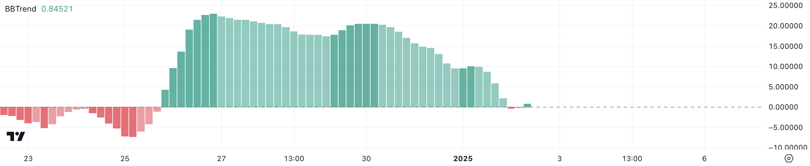 VIRTUAL BBTrend 25 желтоқсан мен 1 қаңтар аралығында оң және күшті болды, 26 желтоқсанда айлық 22.9 деңгейіне жетті. Алайда, индикатор 2 қаңтарда теріс болып, -0.34 деңгейіне дейін төмендеді, содан кейін қазіргі 0.48 деңгейіне сәл қалпына келді.