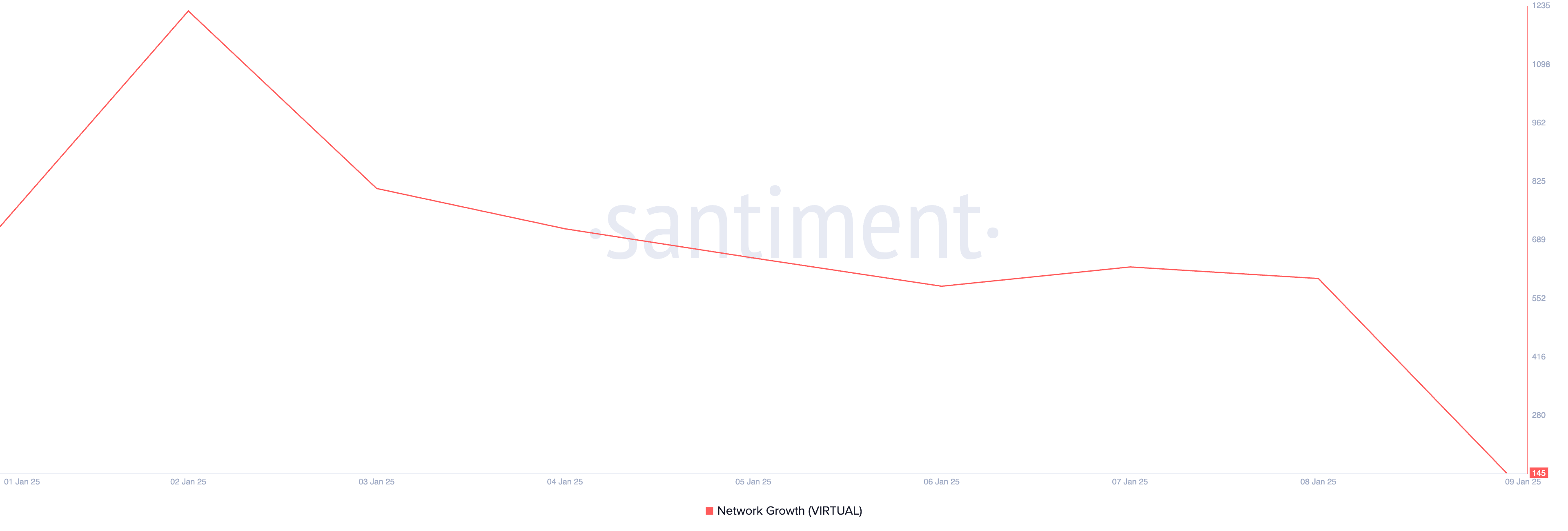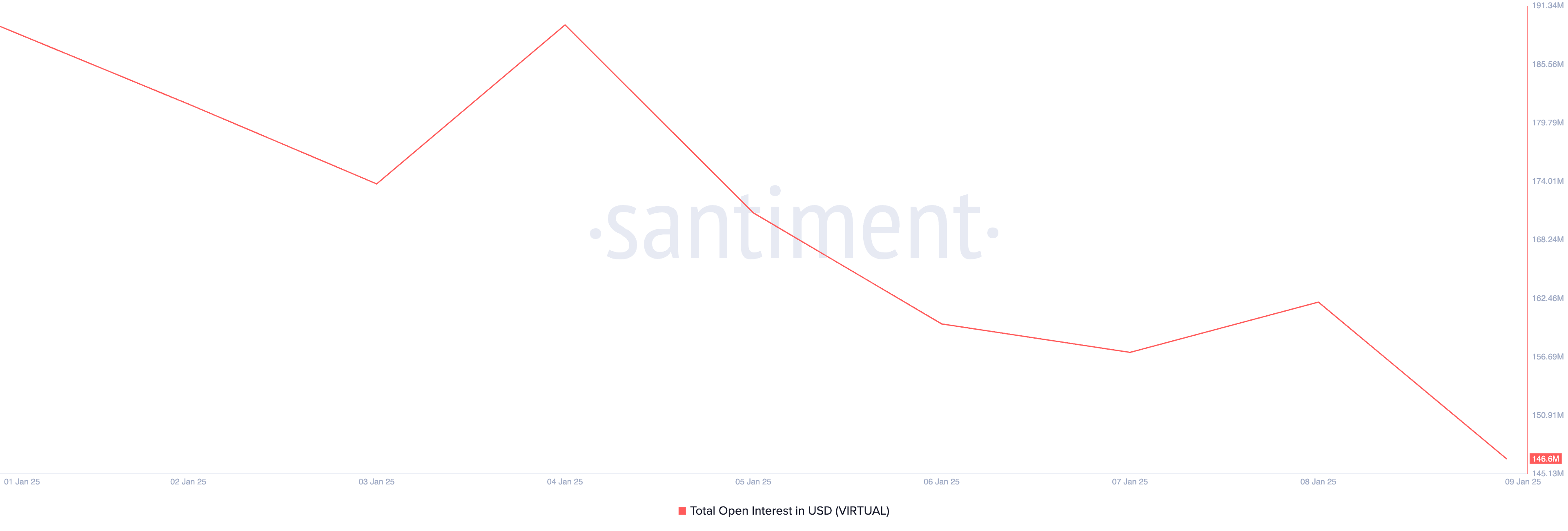 Жалпы нарықтың консолидациясынан бөлек, VIRTUAL-дың екі таңбалы төмендеуі токенге жаңа сұраныстың $5.25-ке жеткеннен кейін төмендеуімен ішінара байланысты. Santiment-тен алынған тізбектегі деректер 2 қаңтардан бері VIRTUAL-ды саудалау үшін жасалған жаңа мекенжайлардың күнделікті санының 88%-ға төмендегенін көрсетеді.