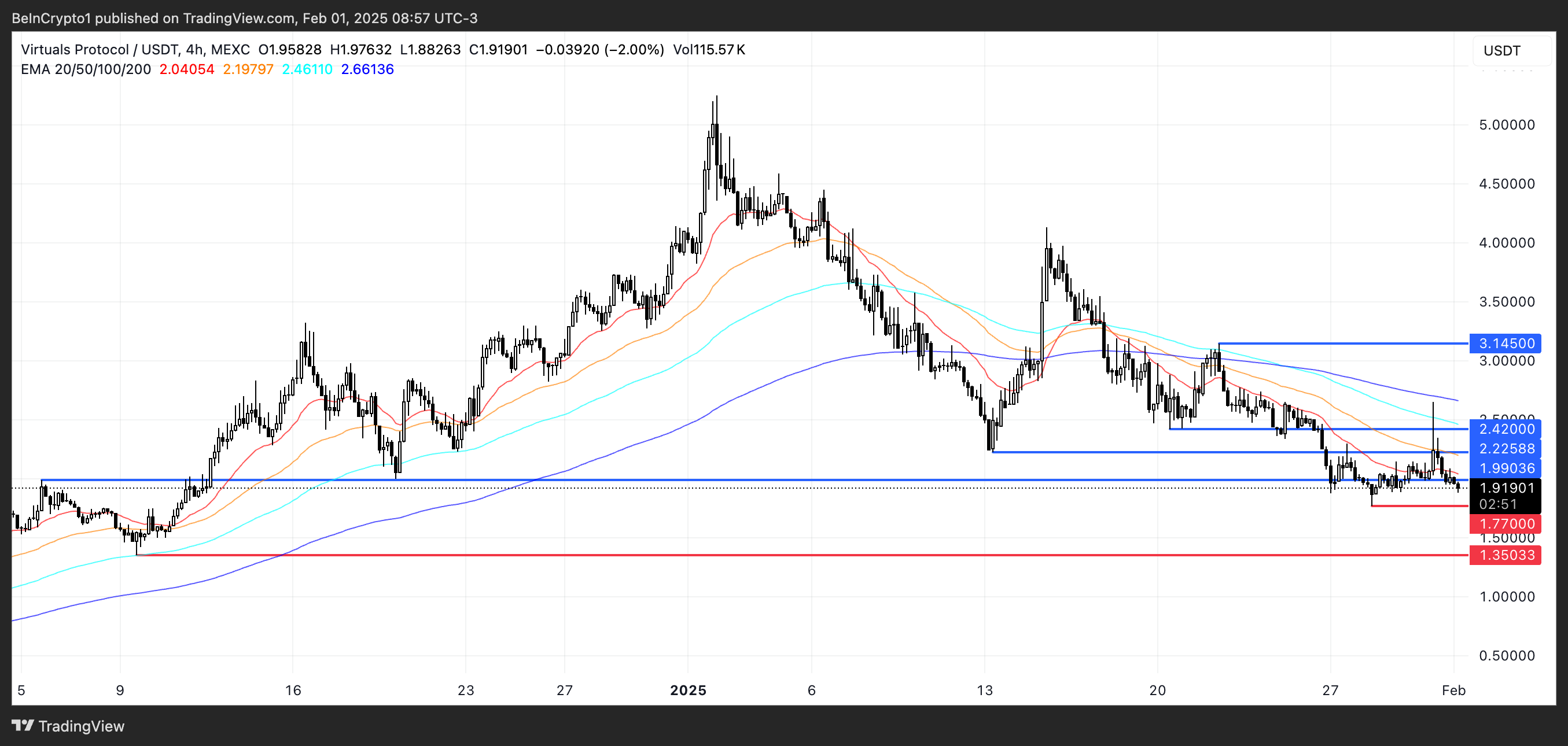 Екінші жағынан, егер 1,77 доллар қолдау сәтсіздікке ұшыраса, VIRTUAL бағасы төмендеу трендін жалғастырып, келесі негізгі деңгей ретінде 1,35 долларға жетуі мүмкін.